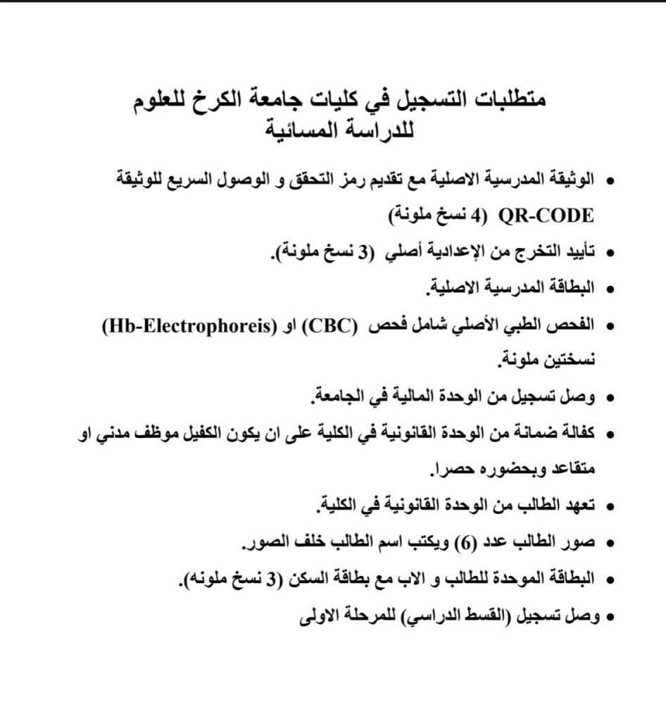 تعلن جامعة الكرخ للعلوم عن بدء التسجيل للدراسة المسائية للكليات التابعة لها للعام الدراسي الجديد.