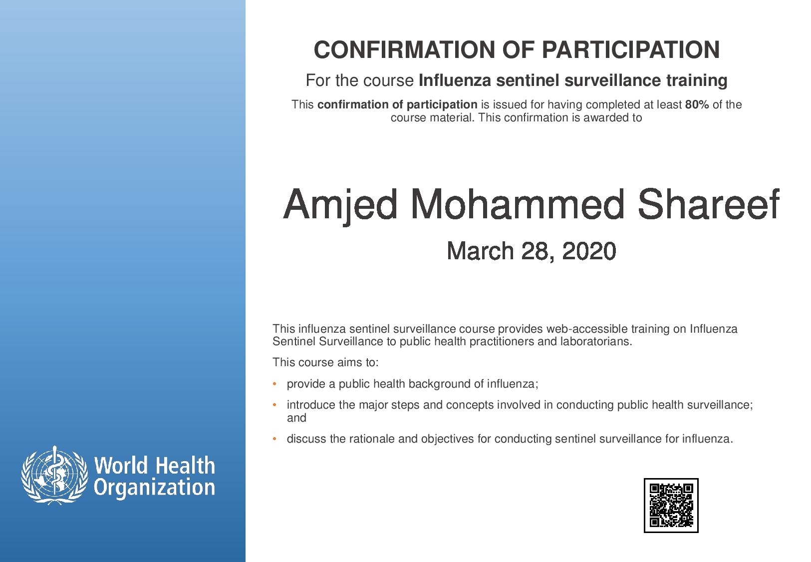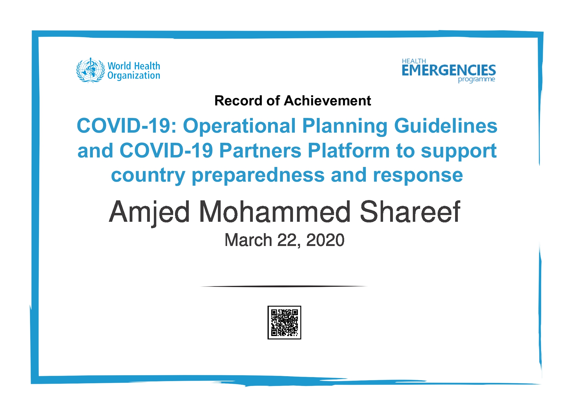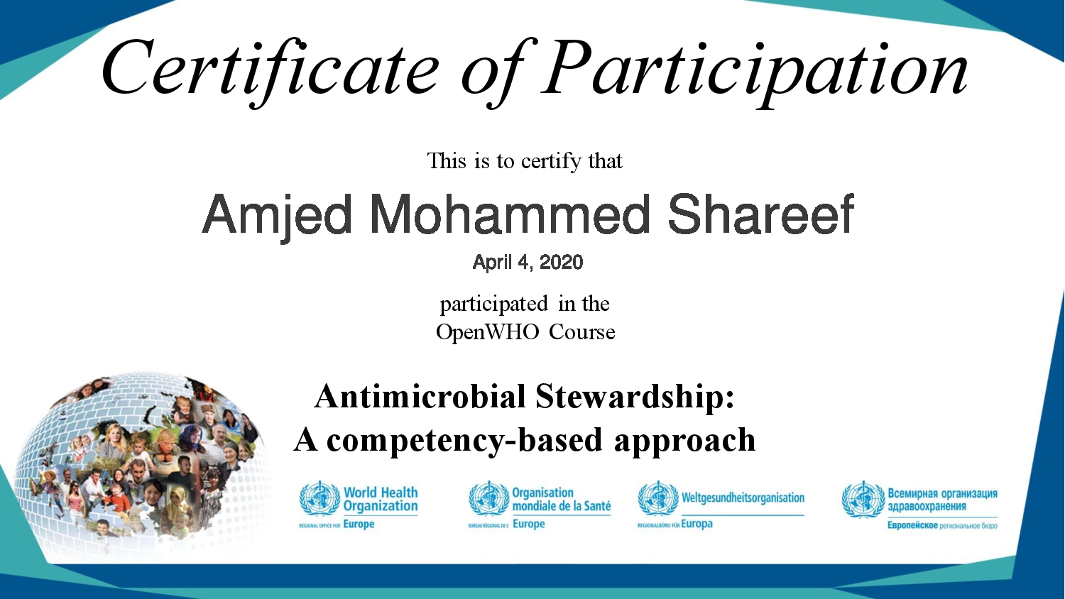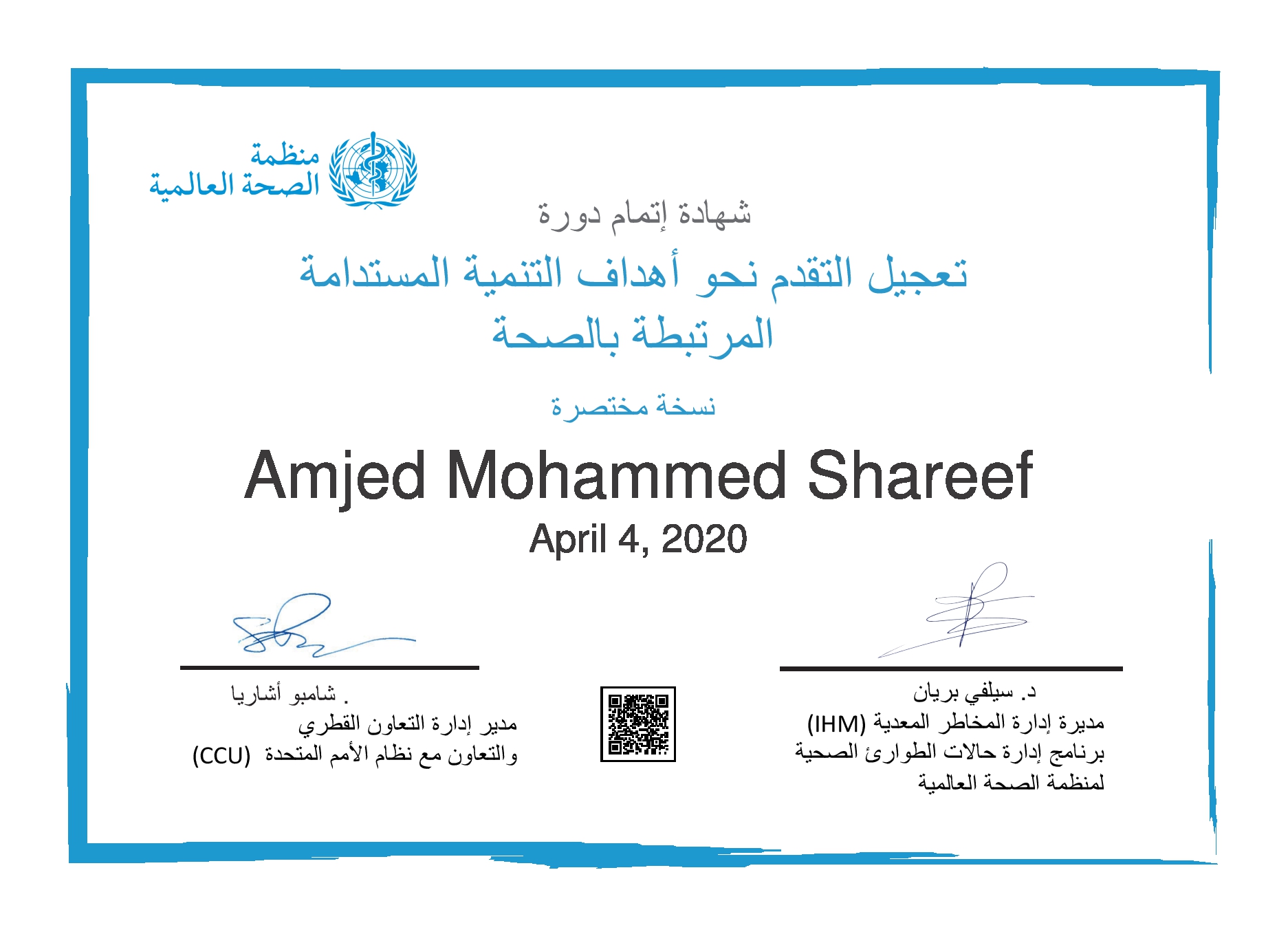 حصل التدريسي م.د امجد محمد شريف من كلية العلوم / قسم الفيزياء الطبية على شهادات اتمام وتدريب من منظمة WHO العالمية.