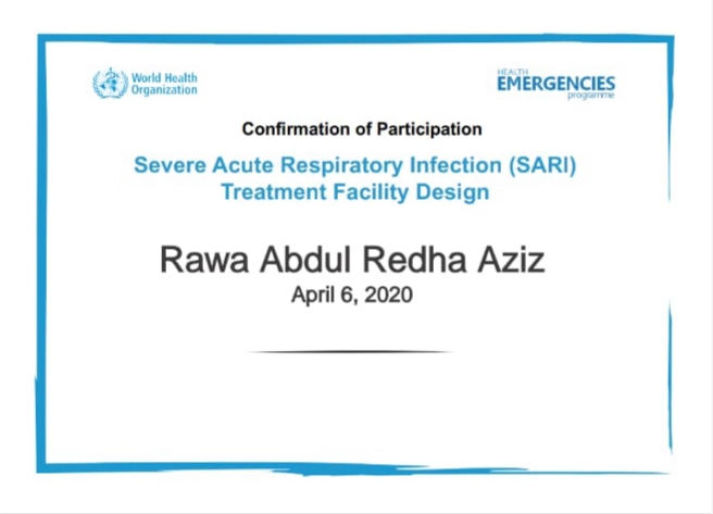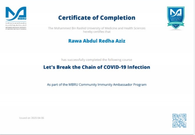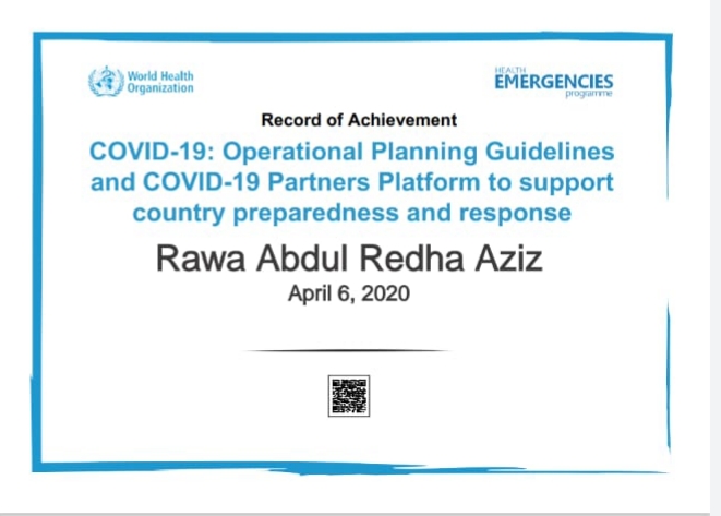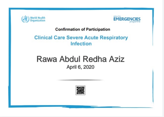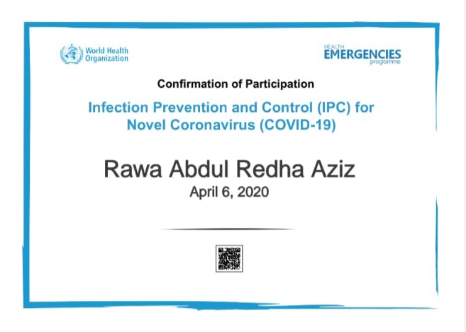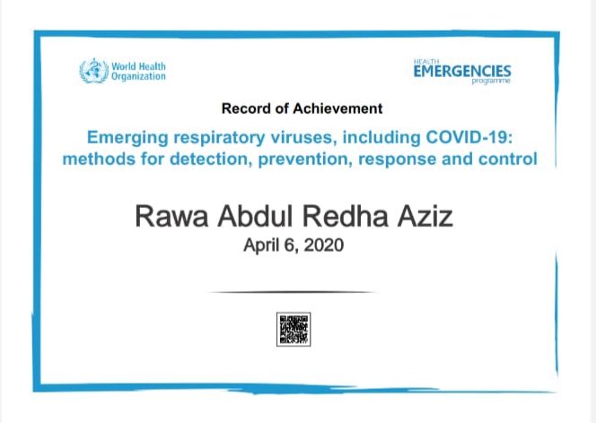 حصلت التدريسية الدكتورة روى عبد الرضا عزيز من كلية العلوم / قسم الاحياء المجهرية على شهادات اتمام دورات تدريبية عن فايروس كورونا المستجد COVID-19 من منظمة الصحة العالمية WHO وجامعة محمد بن راشد بعد اكمالها للاختبارات المطلوبة للحصول على الشهادة.