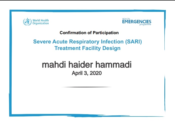 حصل التدريسيين م.د مصطفى عبدالحسين عبدالامير ،ا.م.د. جنان عدنان عبد اللطيف البيروتي ،م.د محمد الجساني ، م.د. مهدي حيدر حمادي من قسم الاحياء المجهرية / كلية العلوم على شهادة من منظمة الصحة العالمية WHO واجتياز الاختبار حول خطط ودليل الاستجابة لفيروس كورونا المستجد: