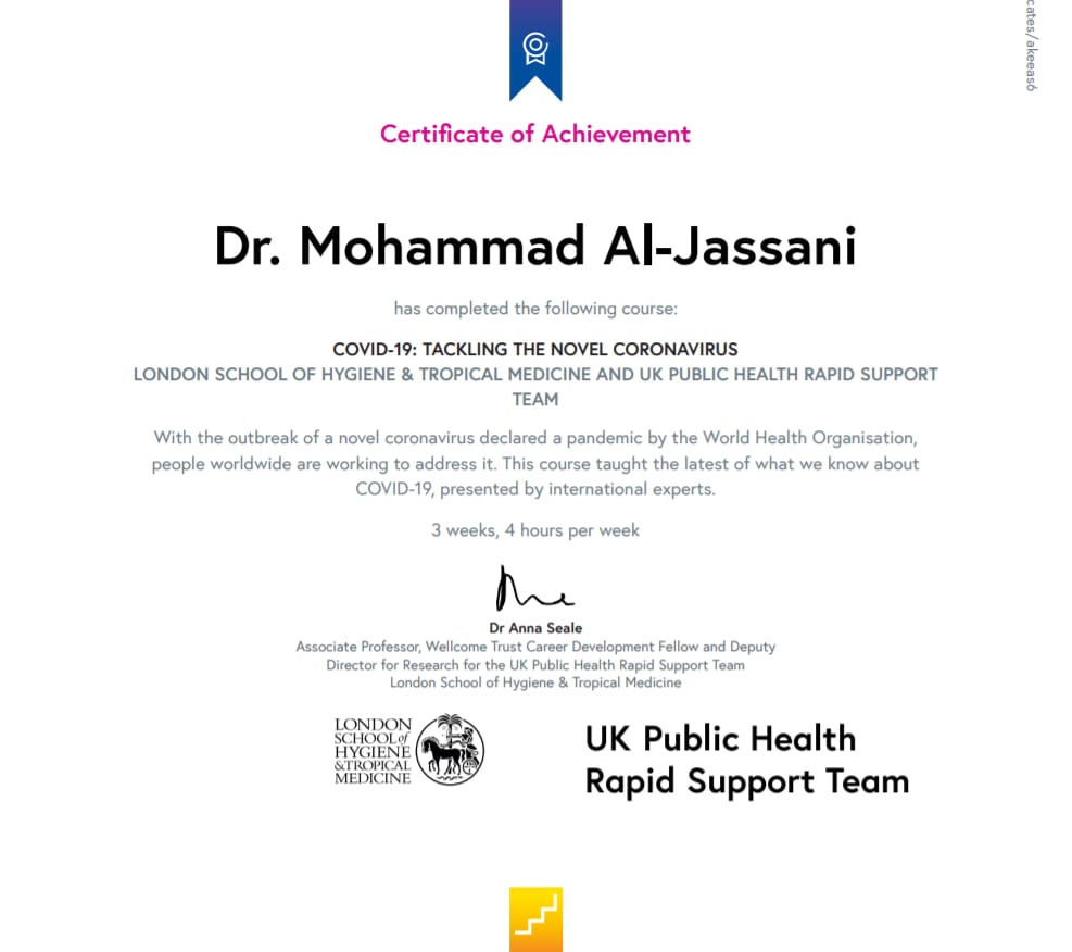 حصول أ.م.د. محمد جواد الجصاني من قسم الاحياء المجهرية في كلية العلوم / جامعة الكرخ للعلوم على شهادة من London school of hygine and tropical medicine and UK public health rapid support team.