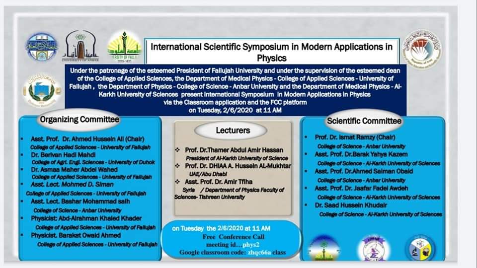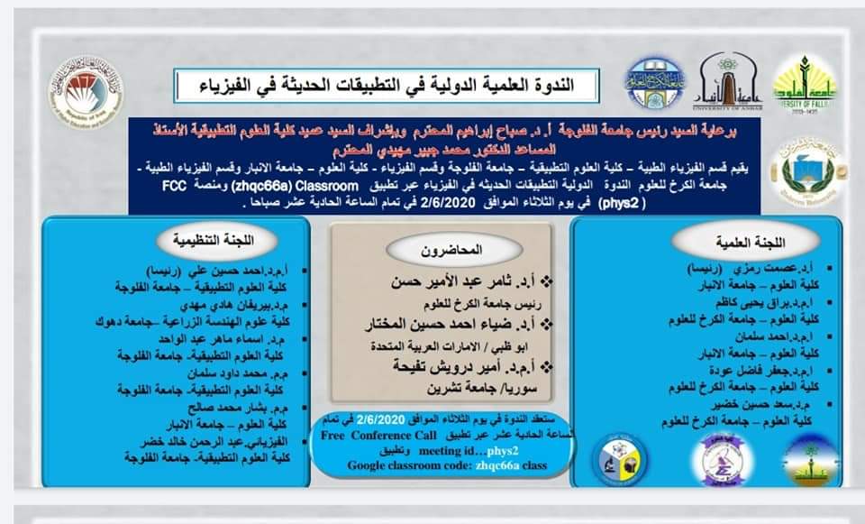 يقيم قسم الفيزياء الطبية في كلية العلوم بالتعاون مع قسم الفيزياء الطبية – كلية العلوم التطبيقية – جامعة الفلوجة وقسم الفيزياء – كلية العلوم – جامعة الأنبار الندوة العلمية الدولية في التطبيقات الحديثة في الفيزياء يوم الثلاثاء الموافق 2/6/2020.