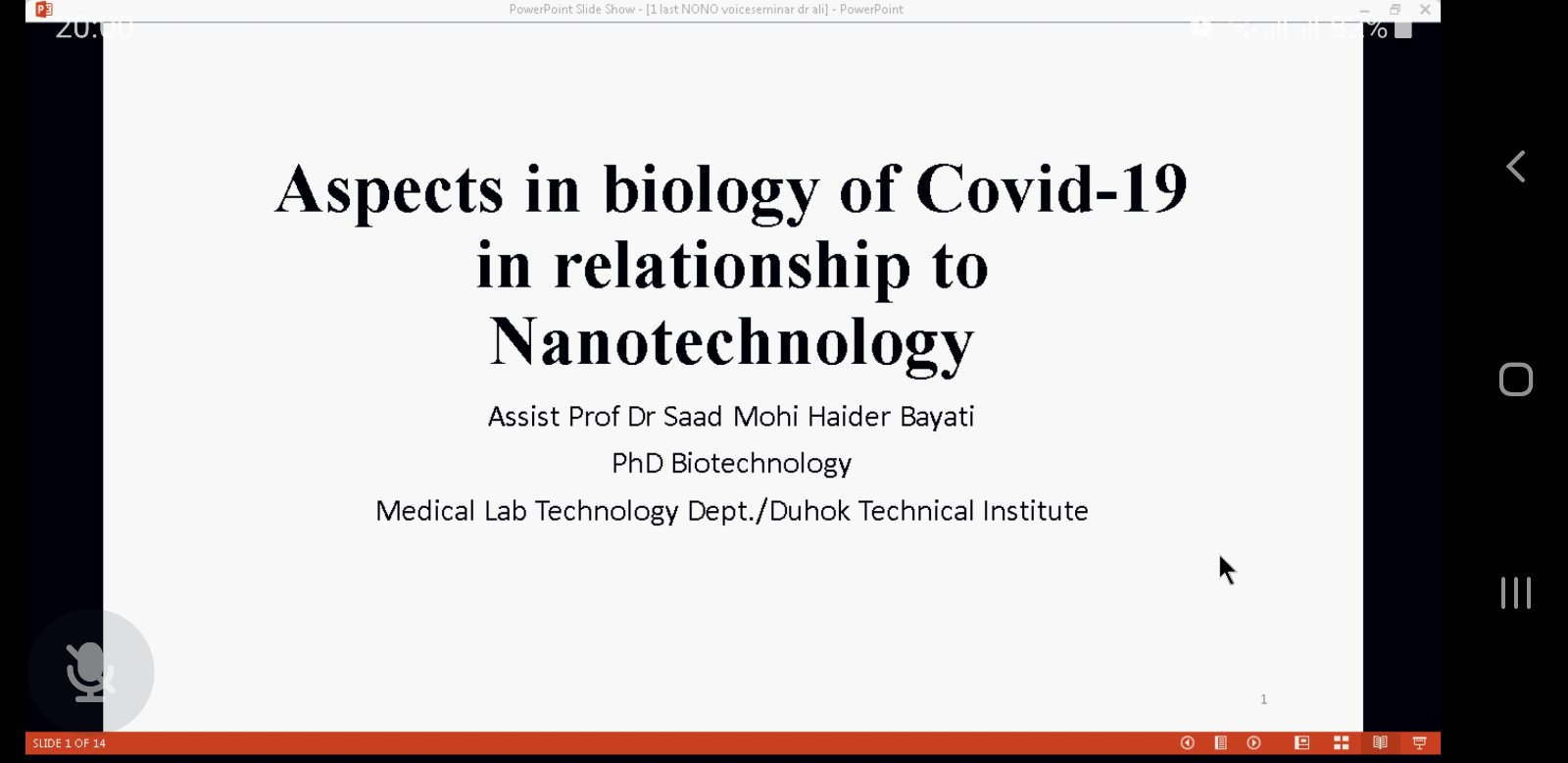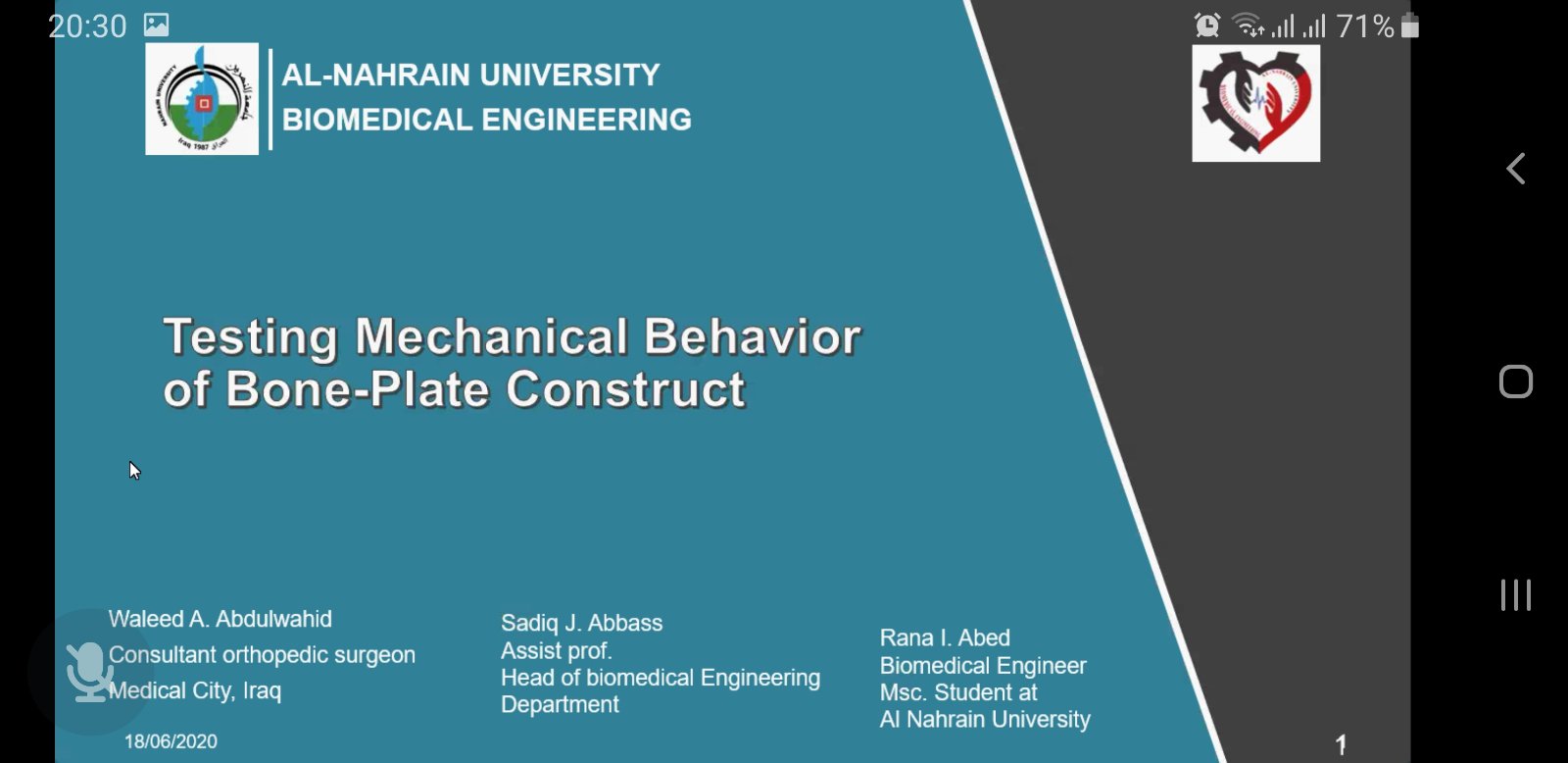 وتضمنت الجلسة الثانية ثلاث محاضرات، المحاضرة الاولى التي القاها أ.م.د سعد محيي حيدر من المعهد التقني الطبي / دهوك التي كانت بعنوان "Aspects in the Biology of COVID-19 in Relation to Nanotechnology" عن فايروس كورونا المستجد ومسبباته واعراضه وتركيبته الكيميائية ودورة حياة هذا الفايروس وكيفية تطوره وانتشاره وايضا تاثير الفايروس على الرئة عند الانسان. وتضمنت المحاضرة الثانية بعنوان "Testing Mechanical Behavior of Bone-Plate Construct" التي القاها الدكتور الجراح وليد عبد الحسن / مستشفى الجراحات والسيدة رنا عيدان عبد من جامعة النهرين / هندسة الطب التي تضمنت كسور العظام ومعالجتها وتطور العلاج باستخدام plates system وخطوات عملية العلاج، وتضمنت المحاضرة الثالثة بعنوان "Wearable Sensors: Technology and Applications" التي القاها التدريسي أ.م.د علي جاسم محمد من كلية العلوم / قسم الفيزياء الطبية وكانت عن المتحسسات المحمولة وانواعها والفرق بينهم واستخداماتها المتعددة خصوصا مع علم البصريات والتطبيقات التي تستخدم فيها هذه المتحسسات في الجانب الطبي.