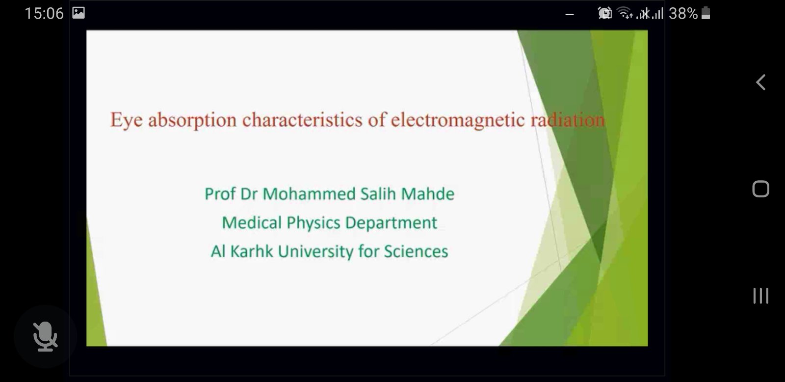 وتضمنت الجلسة الاولى من الندوة التعريف عن تطبيقات الفيزياء الطبية ودورها المهم في المؤسسات الصحية، حيث تضمنت محاضرات القاها مجموعة من الاساتيذ المختصين محاضرات تخصصية في هذا المجال، حيث القى أ.د محمد صالح مهدي التدريسي في جامعة الكرخ للعلوم / قسم الفيزياء الطبية محاضرة بعنوان "Eye Absorption Characteristics of Electromagnetic Radtiation" حيث تم الشرح فيها عن العين وطبقاتها وكيفية دخول الضوء وانعكاسه وما هي الاطوال الموجية وكم موجة يتم امتصاصها من قبل العين وخطورة بعض الاشعة منها المتوازية على العين، وايضا تضمنت المحاضرة الثانية التي القاها م.د منذر سمين شكر من الجامعة التقنية الوسطى بعنوان "Effect of Smart Devices on Eye Ambloyopic and Method of Physical Treatment" حيث تم الشرح فيها عن كسل العين وكيفية علاجه وتضمنت المحاضرة تعريف كسل العين ومسبباته وايضا مرض الحول ومسبباته خصوصا النظر بشكل مستمر وطويل لاجهزة التلفاز والايباد.