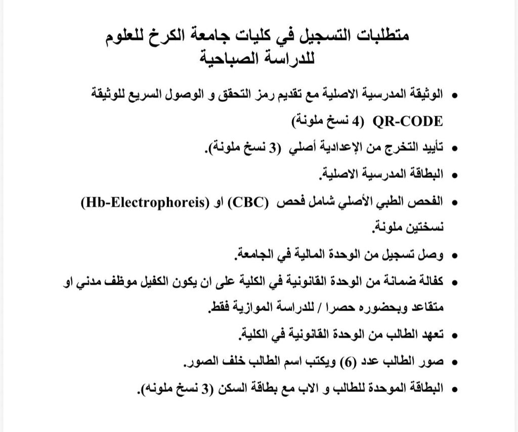تعلن جامعة الكرخ للعلوم عن بدء التسجيل للدراسة الصباحية للكليات التابعة لها للعام الدراسي الجديد.