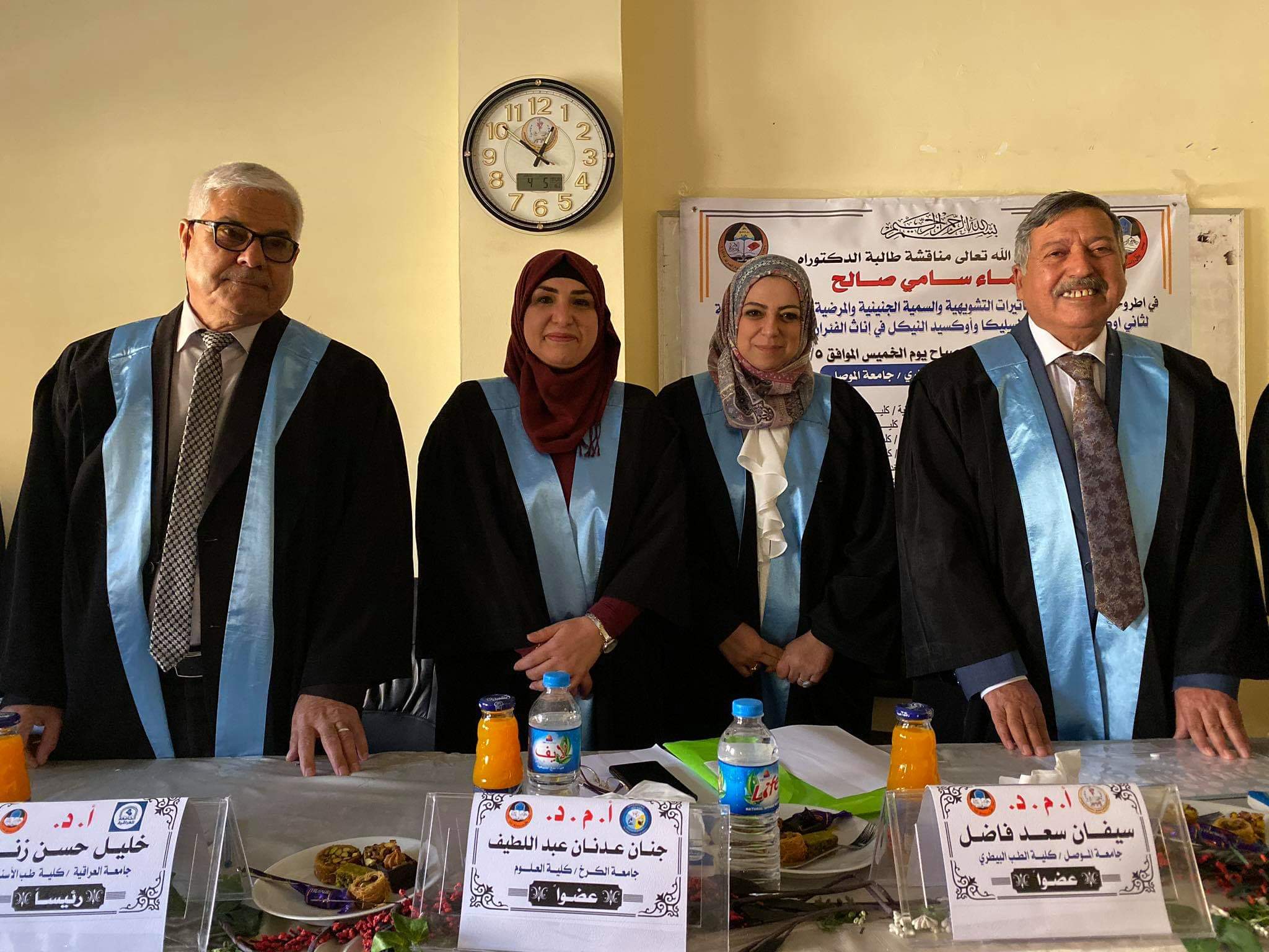 شاركت الدكتوره جنان عدنان عبداللطيف البيروتي التدريسية في قسم الاحياء المجهرية / كلية العلوم بمناقشة طالبة الدكتوراه سيماء سامي صالح في قسم علوم الحياة/كلية التربية للعلوم الصرفة/جامعة الموصل عن اطروحتها الموسومة (التأثيرات التشويهية والسمية الجنينية والمرضية للجسيمات النانوية لثاني اوكسيد التيتانيوم والسليكا واوكسيد النيكل في اناث الفئران الحوامل واجنتها).