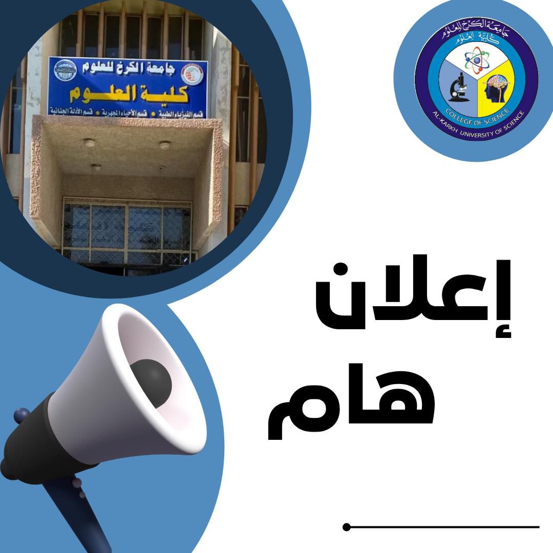 تعلن جامعة الكرخ للعلوم عن بدء التسجيل للدراسة الصباحية للكليات التابعة لها للعام الدراسي الجديد. 2026-2025للاطلاع على متطلبات التسجيل يرجى متابعة صفحتنا عالفيس بوك. شعبة الإعلام والاتصال الحكومي / كلية العلوم