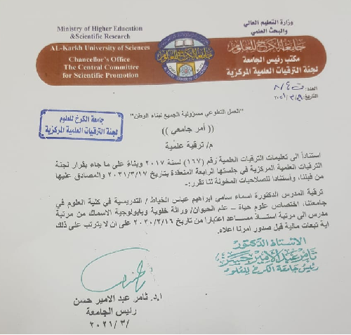 عمادة كلية العلوم تقدم التهنئة للدكتورة اسماء سامي ابراهيم عباس الخياط بمناسبة ترقيتها العلمية