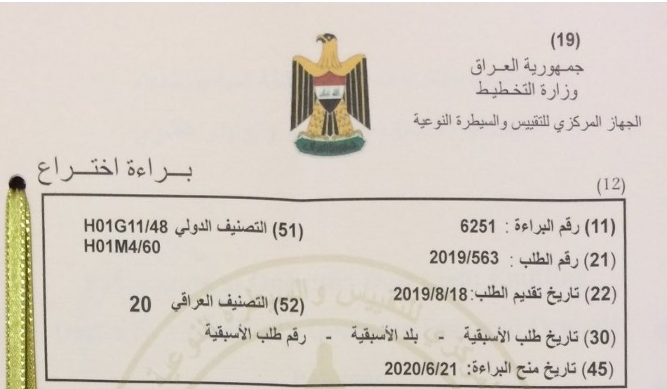 حصل التدريسي في جامعة الكرخ للعلوم / كلية العلوم الدكتور عقيل مهدي كاظم على براءة اختراع عن تصنيع جهاز باعث للضوء نقطة كمية باستخدام تيلورايد الكادميوم نقطة كمية وبوليمر عضوي