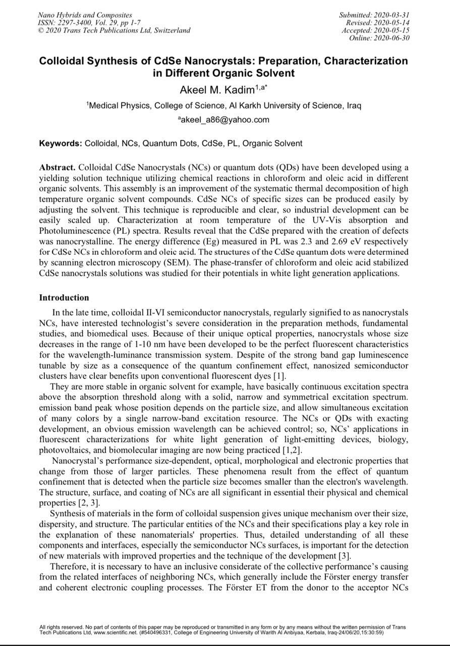 نشر التدريسي في كلية العلوم / قسم الفيزياء الطبية الدكتور عقيل مهدي كاظم على بحث بعنوان ( Colloidal Synthesis of CdSe Nanocrystals: Preparation, Characterization in Different Organic Solvent) السويسرية ضمن مستوعبات (Thomson Reuters)