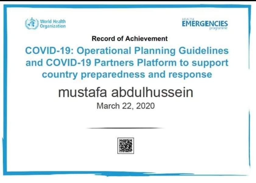حصل التدريسيين م.د مصطفى عبدالحسين عبدالامير ،ا.م.د. جنان عدنان عبد اللطيف البيروتي ،م.د محمد الجساني ، م.د. مهدي حيدر حمادي من قسم الاحياء المجهرية / كلية العلوم على شهادة من منظمة الصحة العالمية WHO